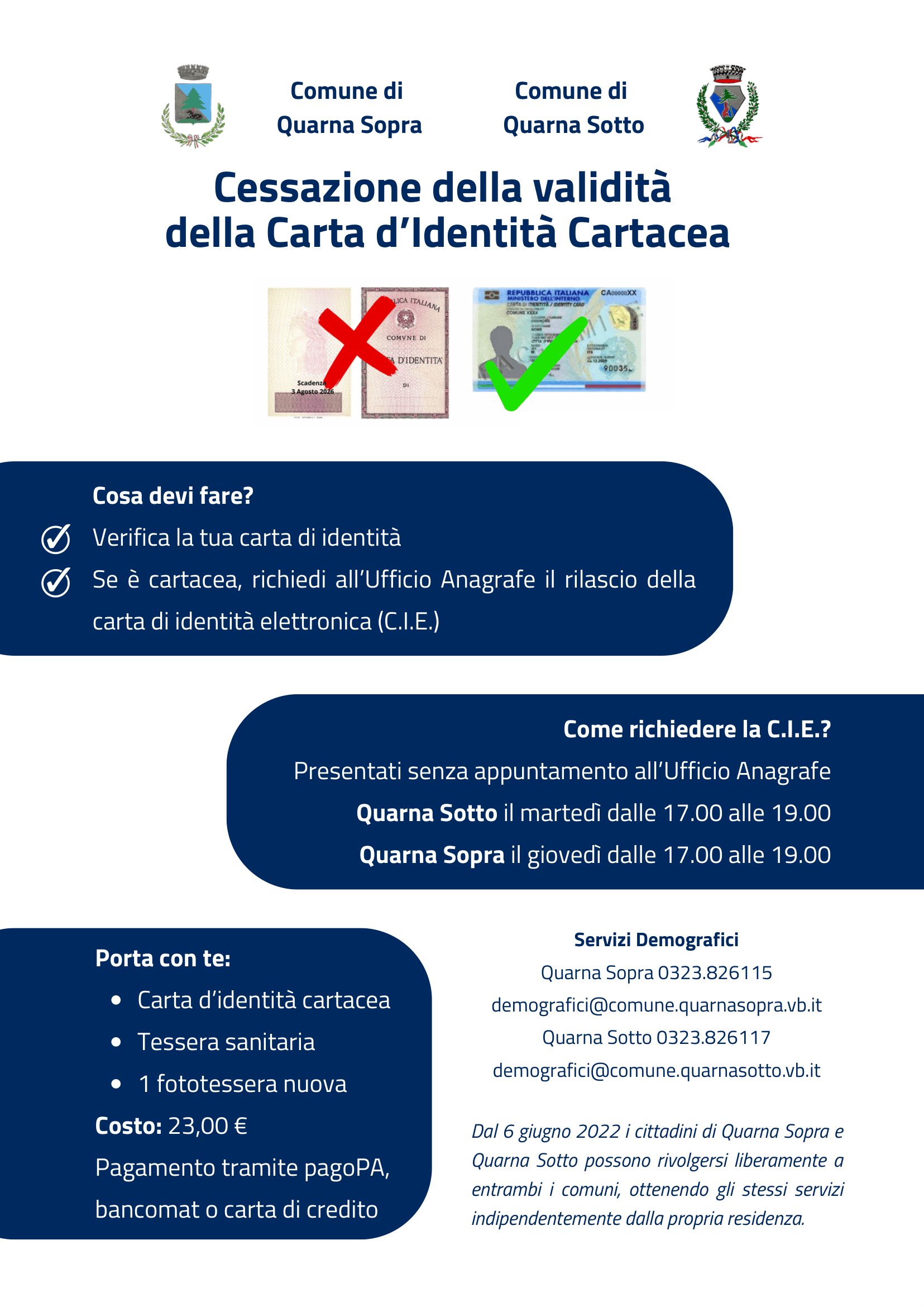 Si rammenta che la carta d'identità rilasciata su modello cartaceo, indipendentemente dalla scadenza riportata sul documento, dovrà essere sostituita con la Carta d'Identità Elettronica (C.I.E.) entro 3 agosto 2026